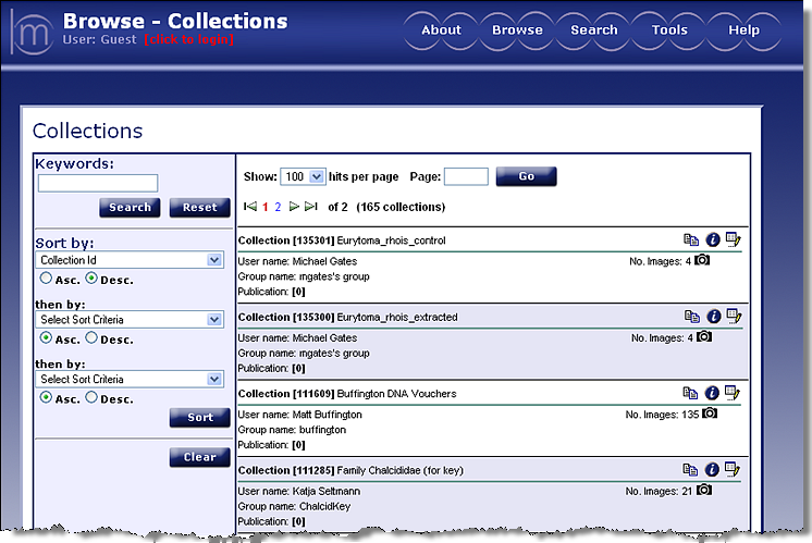 A collection is a group of specimen images that are assembled from the Morphbank database by Morphbank members for the purpose of manipulating (e.g. rearranging the order, editing, and/or annotating, etc.) and storing the images for future use. By selecting the Browse - Collections option, the user will be presented with a list of all published (released by the creator) collections that are registered in the Morphbank database.