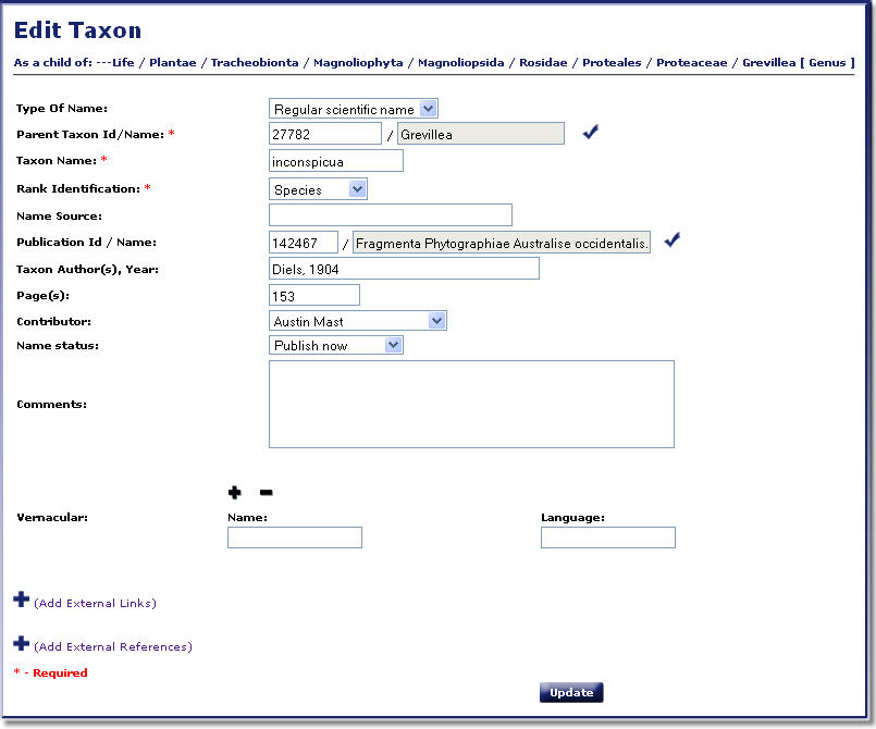 Jump to Add New Taxon Name for more information about the fields for Add/Edit Taxon Name. However, if you find other Taxon Name errors or wish to comment on names you cannot directly edit you may Annotate Taxon Names.