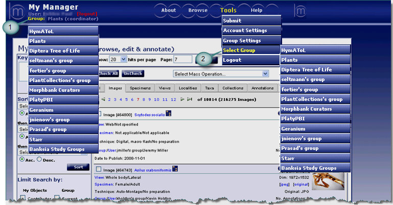 Everyone, logged in or not, uses this My Manager interface. Once logged in, and after group selection, the user has new menu options under Tools such as Submit, Group & Account Settings. Once logged in, contributors can now Edit their objects found in each of the My Manager tabs. Some options not seen above in the Tools menu like Manage Mirror are based upon login permissions and are not available to all Morphbank members. Each My Manager Tab allows users access to their own objects as well as other's objects if they are published.