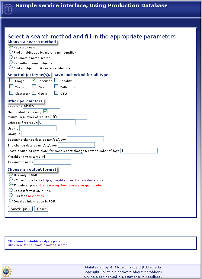 services.morphbank.net/mb3/ makes it possible for anyone to query the Morphbank database. In essence, it is analogous to a Keyword search query in the My Manager interface of Morphbank. The services page lets users construct the query of their choice, selecting what to look for and in what format the output appears. For example, anytime after submitting data and images to Morphbank, a Morphbank Contributor can use the services.morphbank.net/mb3/ interface to return Morphbank Ids for building links. Details about how to find and use services are next.