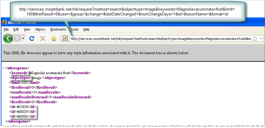 • XML using schema http://morphbank.net/schema/mbsvc3.xsd returns data in XML format that matches the current Morphbank schema.