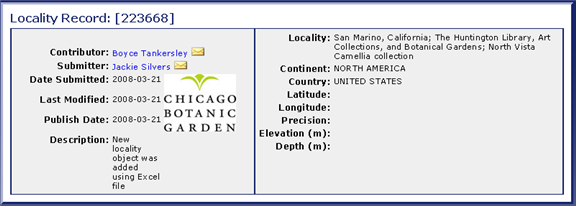 7. Information about the locality of the image. Clicking on the Locality ID will access the Single Show of the Locality Record displayed in a popup screen