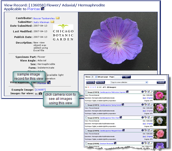 6. Information pertaining to the specimen associated with this image. Click on the Specimen Id to access the Single show of the Specimen (shown next). The Specimen Show will present the user with details about the specimen as well as inform about associated collections or published determination annotations associated with the specimen. Included at the bottom of the Specimen Single Show is an image list of associated images for this specimen (if any). The total number of images is listed and can be viewed through browse-specimens by clicking on the camera icon. Double clicking on a thumbnail image in this area will bring up the Single Show for the image.