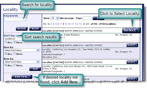 The data entered on the Add Specimen screen provides information about the specimen and the parties involved in the collection of it. If not previously added, provisions have been made on this screen to add a locality, if needed. Locality data is not required. Any instruction label that is followed by an * is a required field and must be completed before submitting.