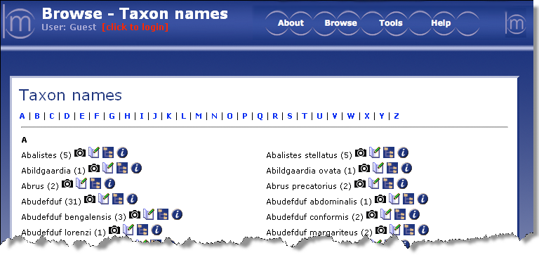In this option, users can avoid possible spelling or name recollection difficulties by using the Browse - Taxon Names option. All taxon names are listed in alphabetic order. The default screen will list all alphabetized taxon names starting with the letter A. To jump to another letter in the list, select that letter from the letter strip.