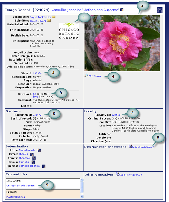 8. List of published determination annotations associated with this image. Clicking on the information button will access the annotation. Unpublished determination annotations will not be listed. Click on Add Annotation to add one, if desired.