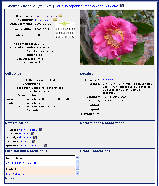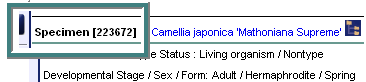 6. Information pertaining to the specimen associated with this image. Click on the Specimen Id to access the Single show of the Specimen (shown next). The Specimen Show will present the user with details about the specimen as well as inform about associated collections or published determination annotations associated with the specimen. Included at the bottom of the Specimen Single Show is an image list of associated images for this specimen (if any). The total number of images is listed and can be viewed through browse-specimens by clicking on the camera icon. Double clicking on a thumbnail image in this area will bring up the Single Show for the image.